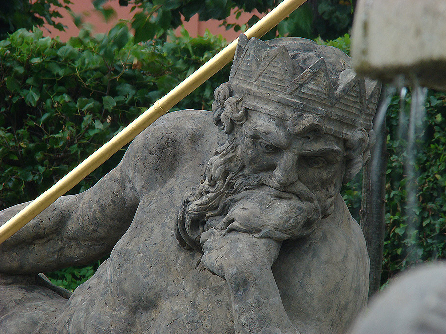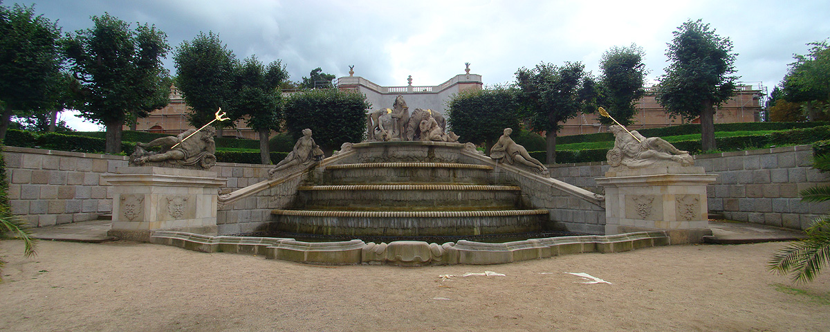 francouzská zahrada záhony před fontánou jedna ze soch na fontáně Heliových koní pohled na zámek od fontány