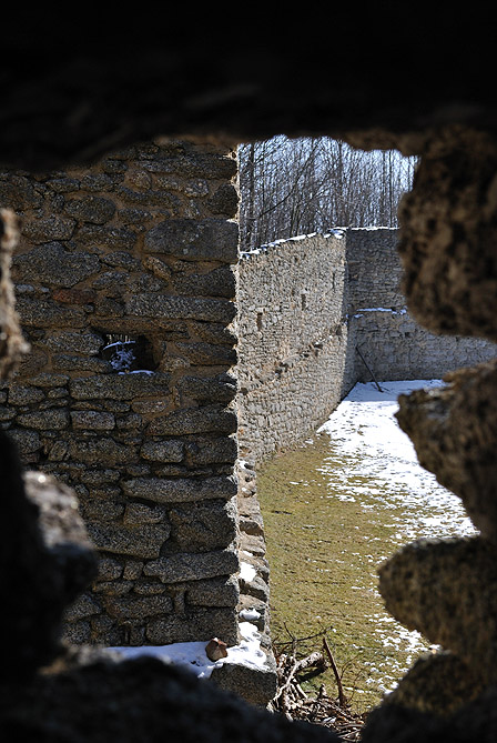 Landštejn vyhořel v roce 1771 pohled skrz hradební střílnu výhled na Landštejn