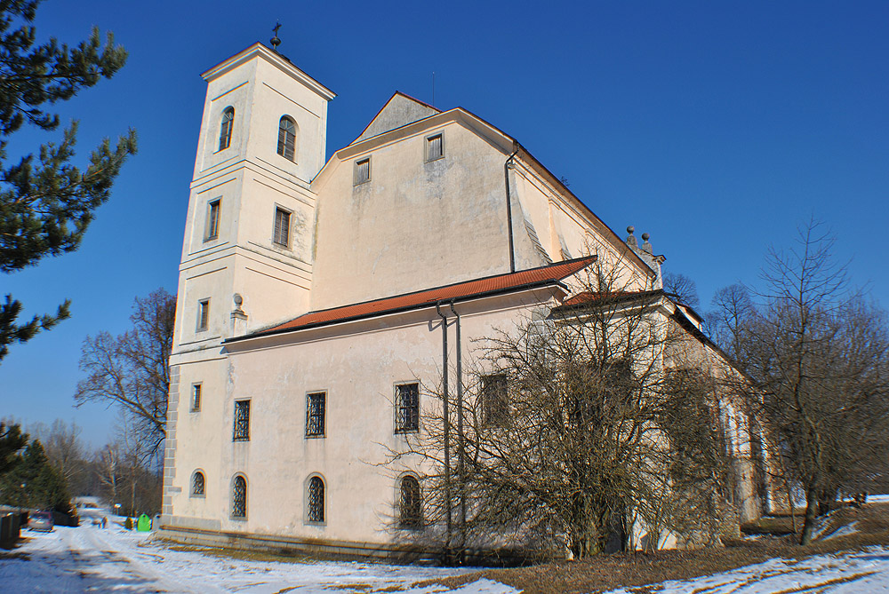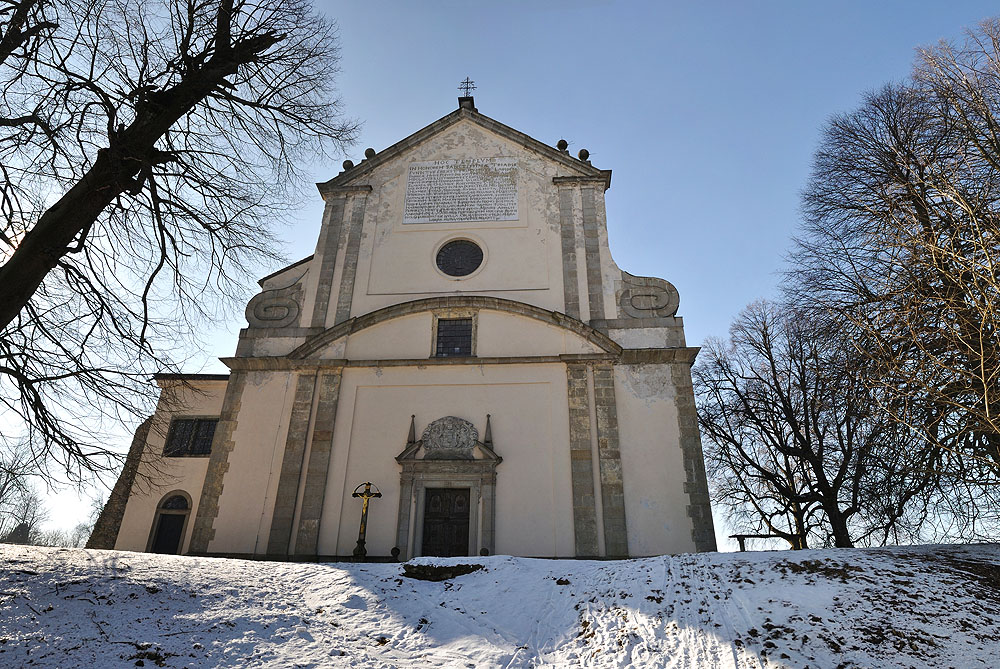 výhled skrz střílnu kostel Nejsvětější trojice v osadě Klášter kostel z druhé poloviny 17.století průčelí kostela Nejsvětější trojice