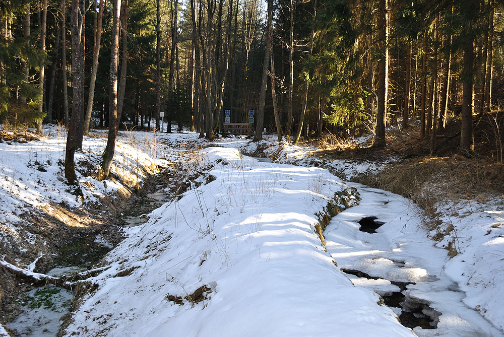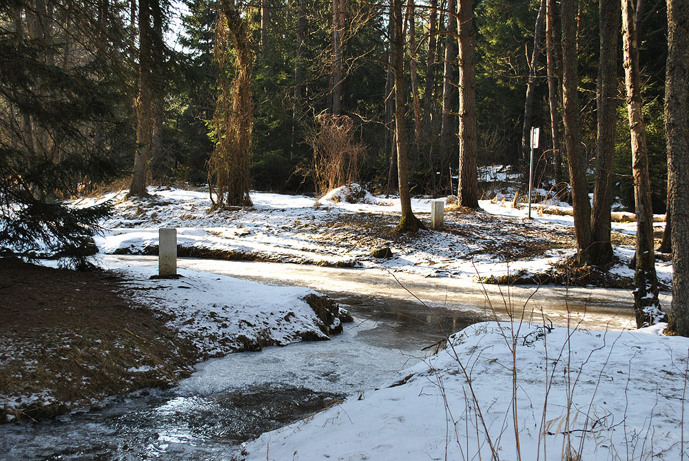 nejsevernější bod Rakouska na soutoku Červeného (v popředí) a Koštěnického potoka česko-rakouské pomezí u Červeného potoka Most do údolí lásky lesní hotel Peršlák a Kámen republiky