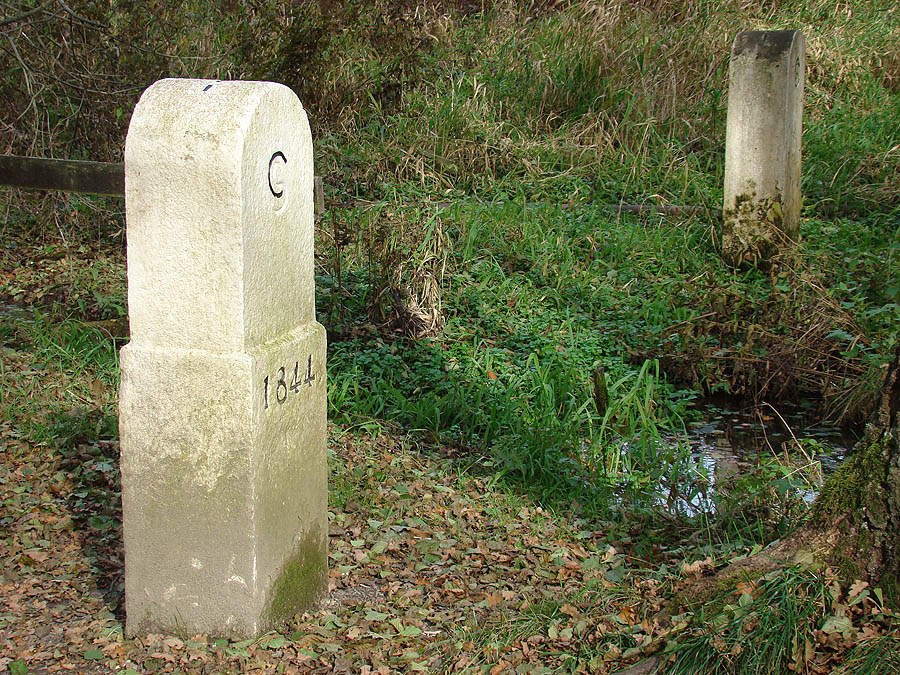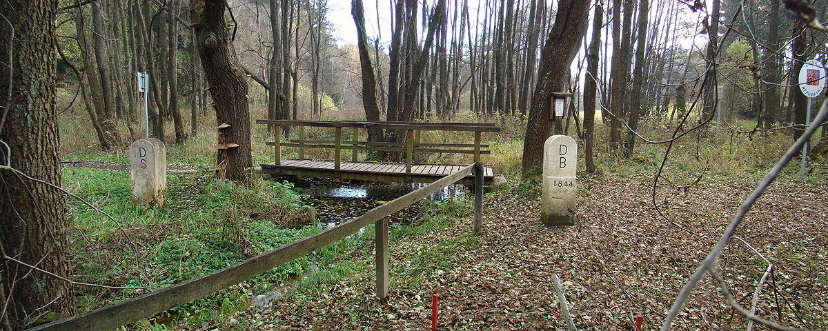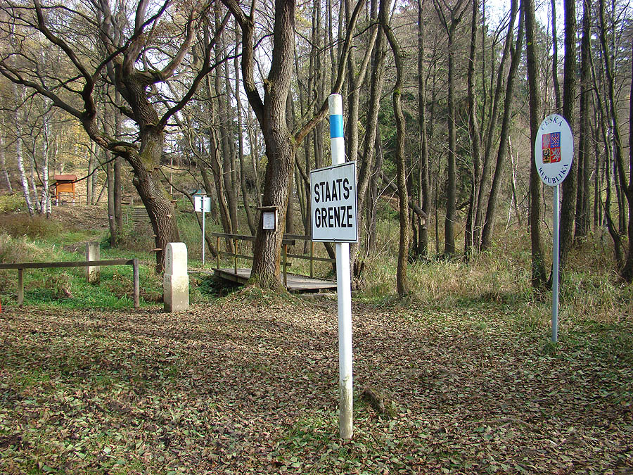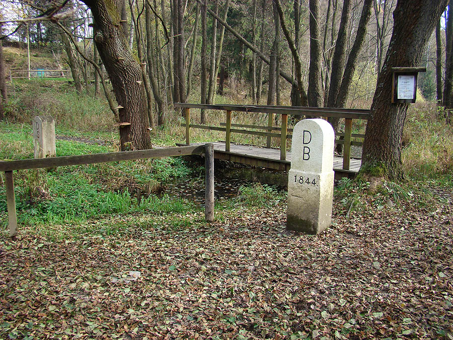 trojmezí - v potoce nalevo od bavorského kamene se stýkají hranice ČR, Bavorska a Saska Sasko-český (vlevo) a bavorsko-český (vpravo) hraniční kámen areál trojmezí, vlevo Německo, vpravo Česká republika