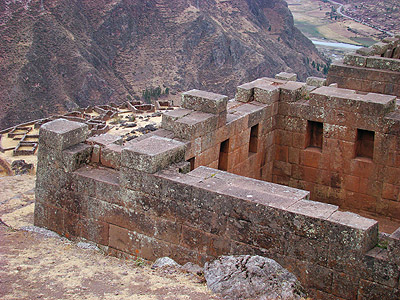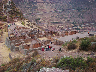 Většina budov v Pisacu je poměrně zachovalá. Jsou tu k vidění stejné zdi, jako například v kostele Santo Domingo v Cuzcu.   Z nejjižnější části ruin je pěkný výhled na městečko Pisac. Po serpentínách, které jsou vidět v pozadí, za chvíli pojedeme zpátky do Cuzca. Cestou budeme muset překonat kulminační bod v nadmořské výšce 3832m.