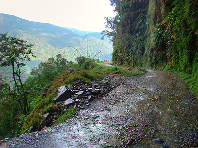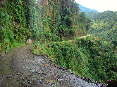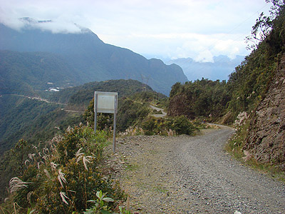 Asi nejzábavnější úsek "silnice" vede několik desítek metrů pod vysokým vodopádem. Představte si, že se v těchto místech míjí autobus s náklaďákem. A představete si, že sedíte v tom autobuse! Na levé straně :-)   Sráz pod silnící je vskutku vysoký. Pády aut dolů do propasti nebyly ničím výjmečným, proto se cestě trefně říká "Camino dela muerte - Silnice smrti". Pomníčky na okraji srázu (viz.křížek u cesty v levé části snímku) by mohly vyprávět...