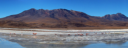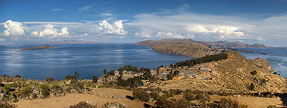 120° panorama složené z 11 fotografií. Výhled z nadmořské výšky 4076m na jihovýchodní část ostrova. V levé části leží uprostřed jezera Titicaca Isla de la Luna, v pozadí uprostřed je vidět kopcovitý polootsrov Yampupata, úplně vpravo vybíhá do jezera Titicaca poloostrov Kakayo-Queňa, který je součásti isla del Sol.