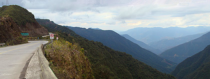 360° panorama složené z 19 fotografií bylo pořízeno před dlouhým tunelem na nové silnici z Coroica do la Pazu. Od tunelu nalevo se rozkládá údolí, po jehož protějším svahu probíhá proslulá Camino de la Muerte. |