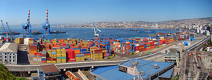 201° panorama složené z 16 fotografií. Přístav na pobřeží Tichého oceánu ve Valparaisu z vyhlídky na ulici 21 de Mayo. V pozadí sousední město Viňa del Mar.