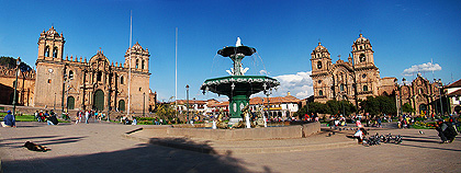 360° panorama složené ze 17 fotografií. Náměstí Plaza de Armas v samotném centru Cuzca. Uprostřed panoramatu stojí kostel La Compania de Jesus, dále vlevo kašna, Katedrála, kostel Jesús Maria a dále podloubí lemující téměř celý zbytek náměstí.