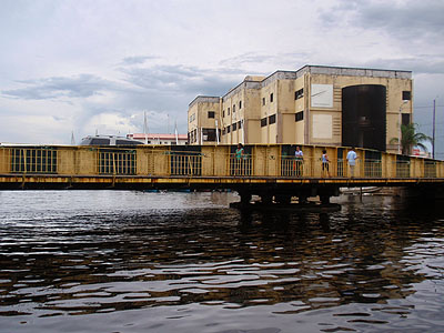 Belize City - poté, co jsme se vymotali z Tourist Village, objevila se před námi zátoka Haulover, kterou před jejím ústím do moře překlenuje tento železný otevírací most z roku 1923, který se jmenuje Swing Bridge.