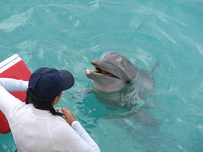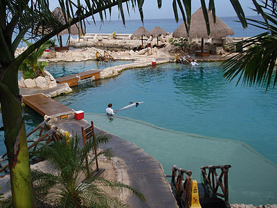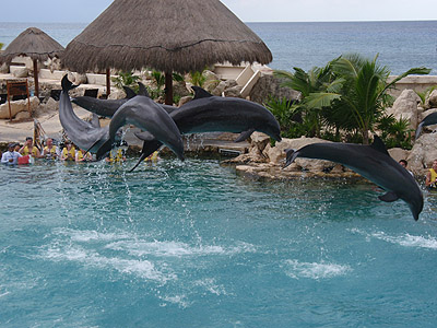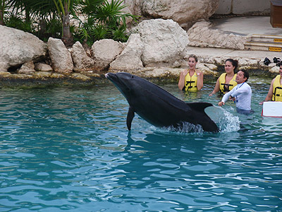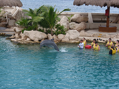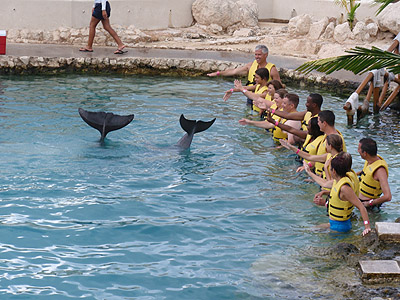 Na dnešek jsme si zaplatili plavání s delfíny (100USD/os.). S příslušnou skupinkou spolucestujících jsme se proto hned po příjezdu přesunuli do nedalekého delfinária na okraji San Miguel de Cozumel.   Byla to velice zajímavá zkušenost, zdejší průvodce nám podrobně i s ukázkami popsal delfinní anatomii, povyprávěl něco málo o jejich životě a samozřejmě jsme si mohli s vybranými kytovci (Tina a Ego) v rámci velmi omezených možností i trochu zadovádět.
