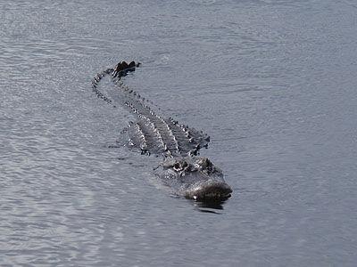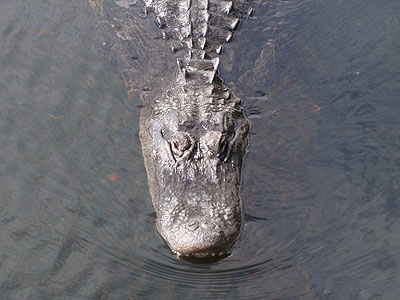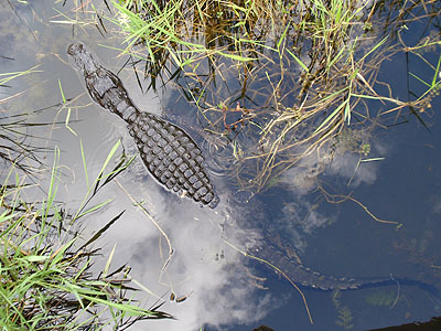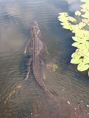 Abychom si ho mohli pořádně prohlédnout, připlaval aligátor vzroně až pod dřevěný chodník, na kterém jsme stáli. Chvíli se schoval v jeho stínu a potom pokračoval v plavbě dál mezi lekníny.