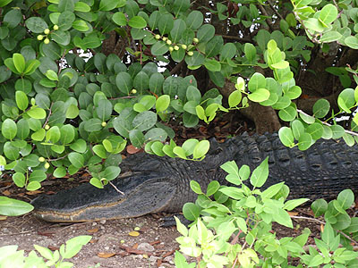 Na chvíli jsme se zastavili na další slepé odbočce, která nás zavedla k nevelkému mokřadu. Jak se tak rozhlížíme, tak najednou zjišťujeme, že ve křoví hned vedle chodníku leží další aligátor. Naštěstí spal...