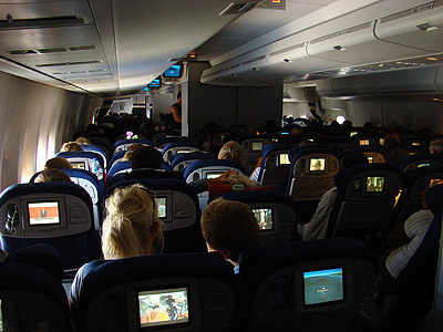 "Jumbo" vypadá na první pohled prostorně, ale opak je pravdou. Cestující v ekonomické třídě jsou namačkáni jako sardinky. Ještě že jsme si po internetu zabookovali docela dobrá místa v levé řadě směrem do uličky, takže jsme během letu mohli nerušeně korzovat, případně se protáhnout u nouzových východů.