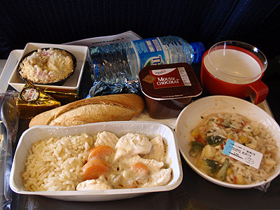 Necelé dvě hodiny před přistáním se servíruje večeře. Máme kuřecí maso s rýží, salát, zákusek a jogurt. Nic extra, ale člověk se aspoň trochu najedl...