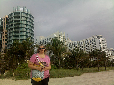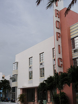 Po mnohaproudé miamské dálnici jsme se přesunuli na Miami Beach. Toto je náš hotel Tropics, který jsme si zamluvili přes internet. Pokoj s vlastní koupelnou stojí 90USD na noc. My zde budeme spát celkem třikrát, takže po předchozím zaplacení zálohy doplácíme 245USD + 20 USD vratnou zálohu na klíč. Hotel stojí na Collins Avenue dva bloky (cca 300m od pláže). Hned v sousedství se nachází velký parkovací dům (16USD/den), takže odpadají jinak dost nezanedbatelné starosti se zaparkováním auta.